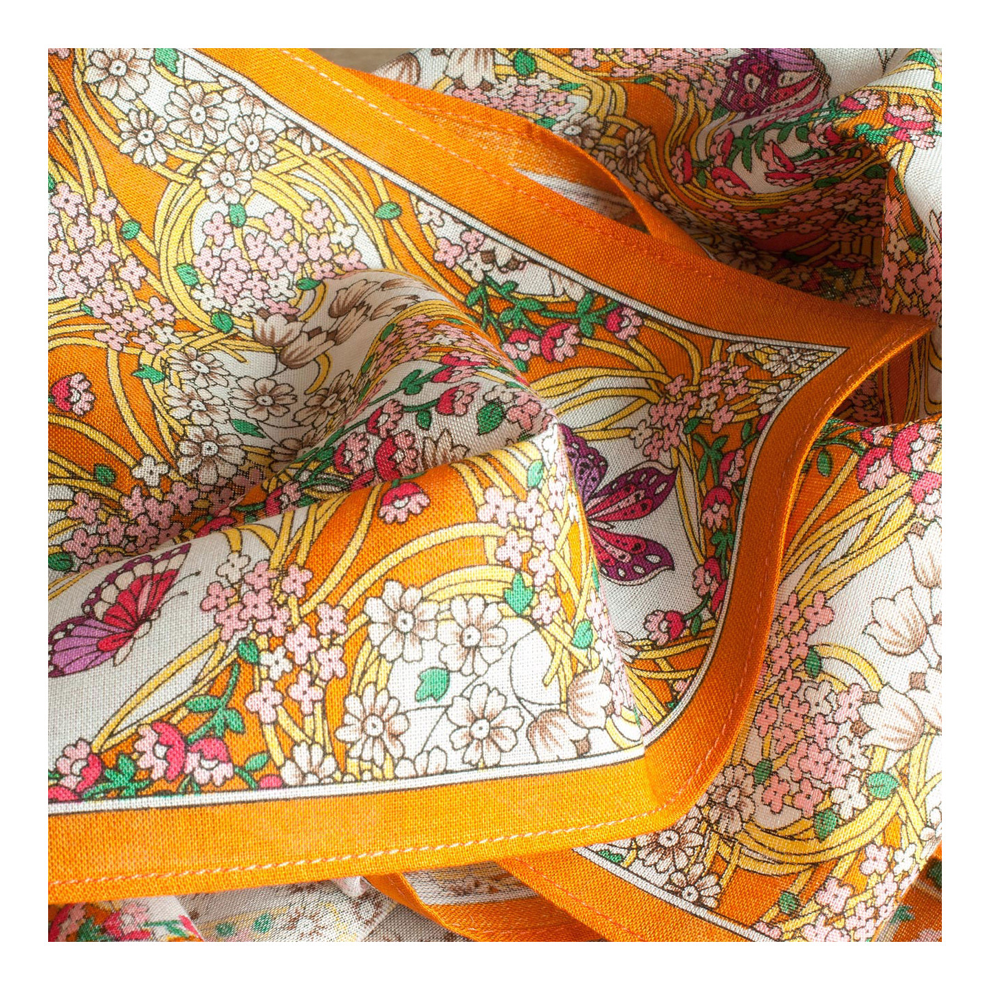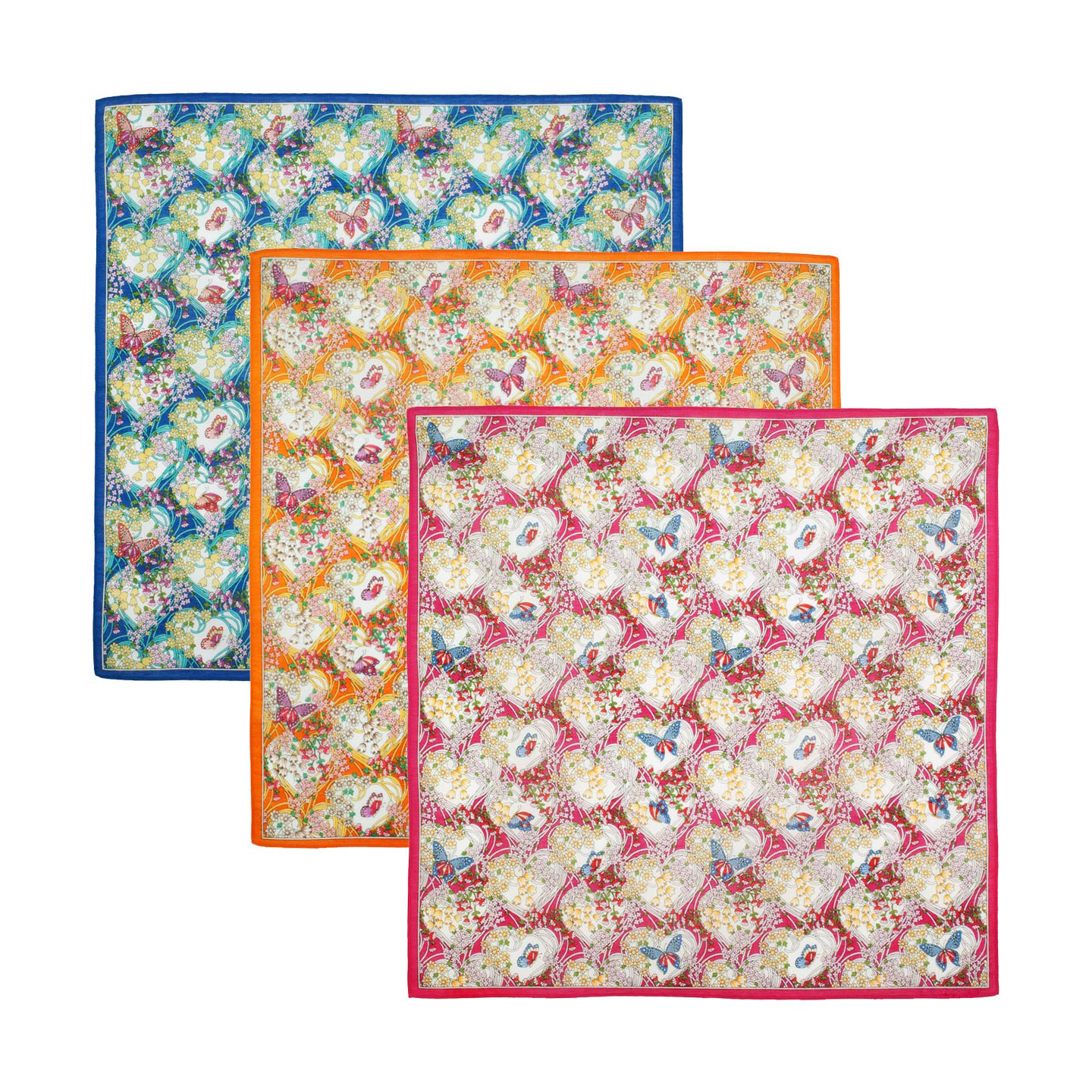 FANTAISIE FLEURIE ♦ Cœurs, fleurs et papillons pour ces mouchoirs aux coloris pimpants : bleu Directoire et turquoise, fuchsia et rouge coquelicot, orange exubérance et rouge carmin. Des mouchoirs qui se porteront également comme gavroche ou dans les cheveux. Un caprice exubérant qui réveillera toutes les toilettes.