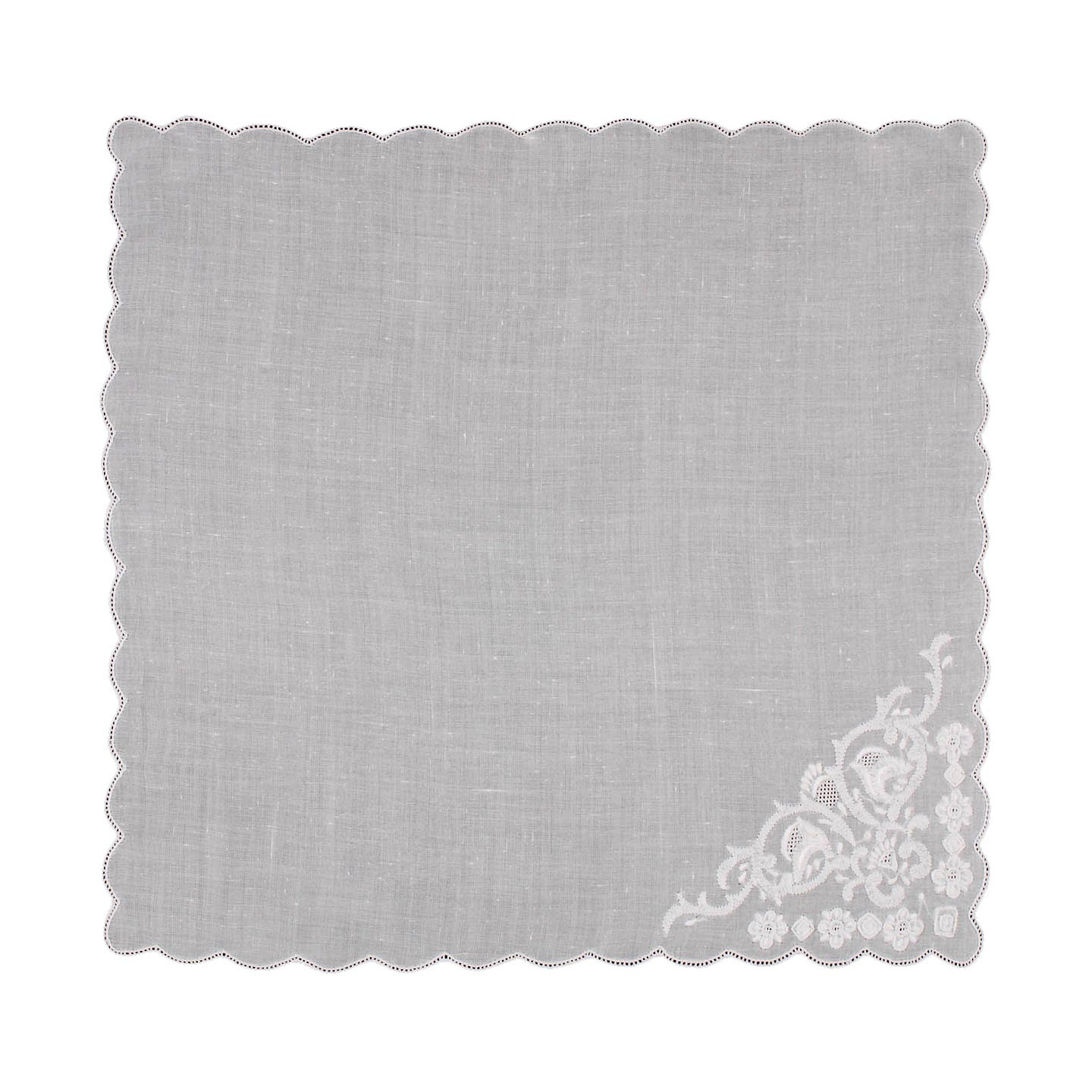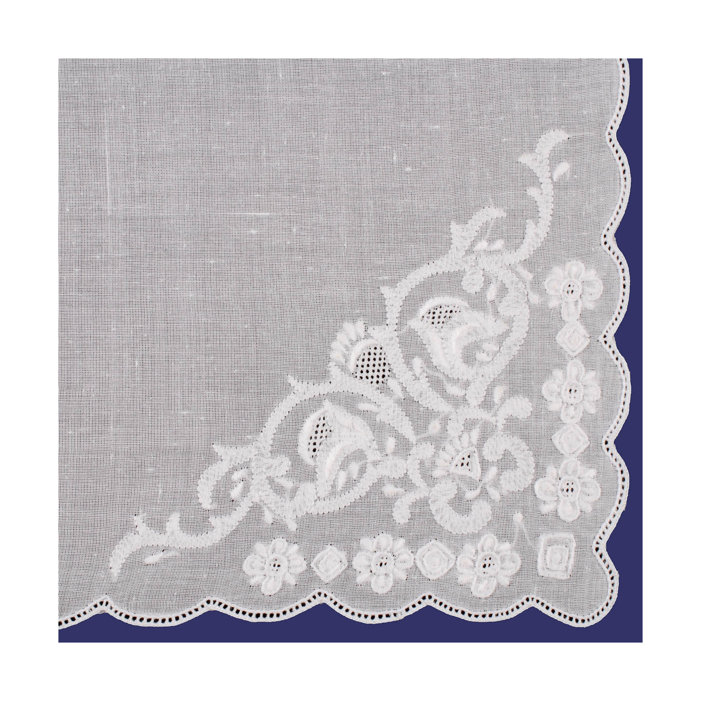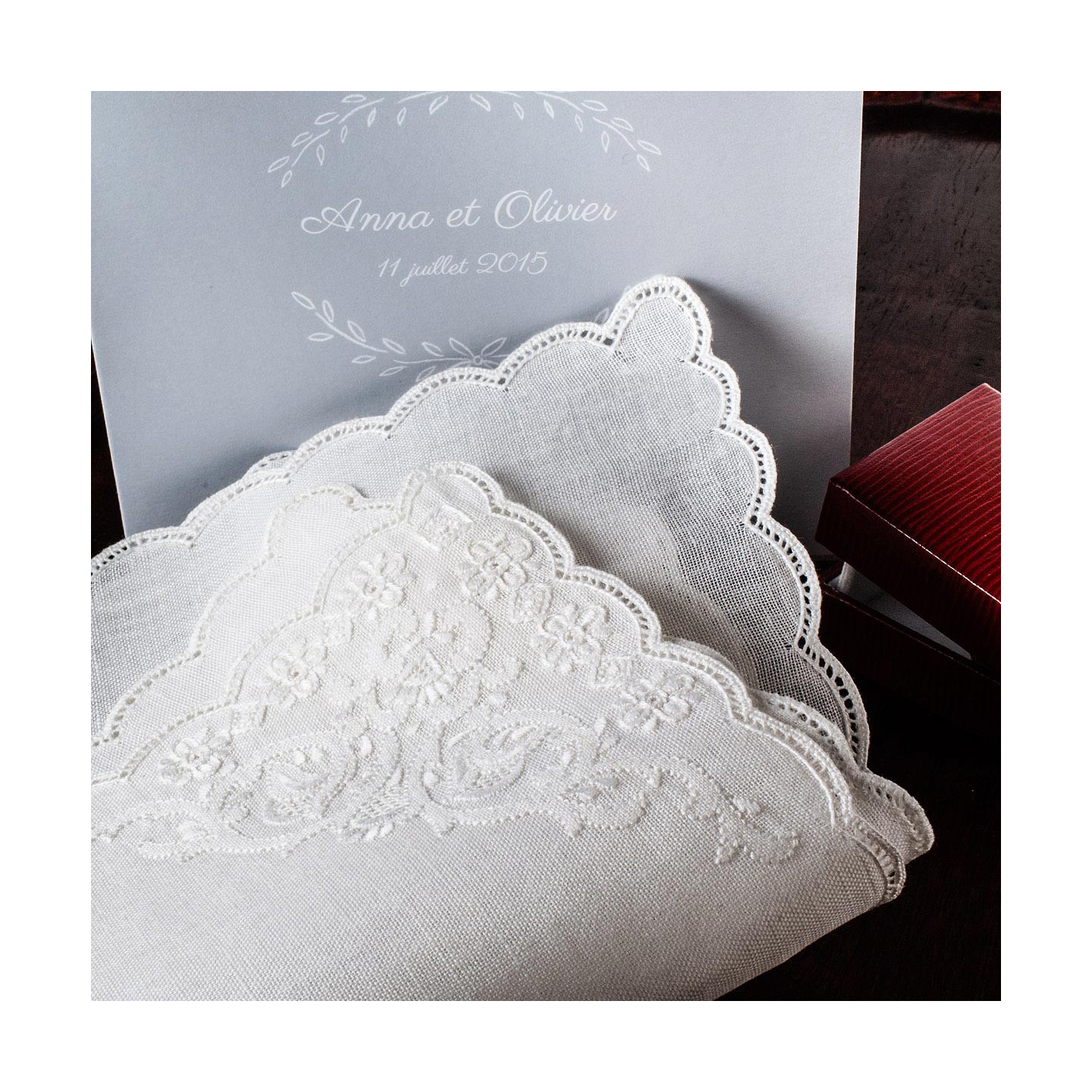 Avertissement : ce mouchoir neuf est encore fortement empesé, raidissement nécessaire au travail de la brodeuse. Il faudra éventuellement plusieurs lavages doux à l'eau tiède et à la main pour en retirer l'apprêt et assouplir ses fibres de lin.