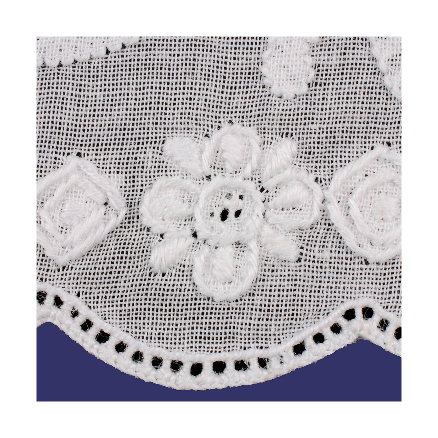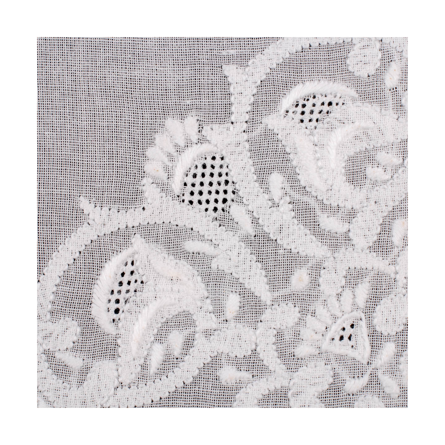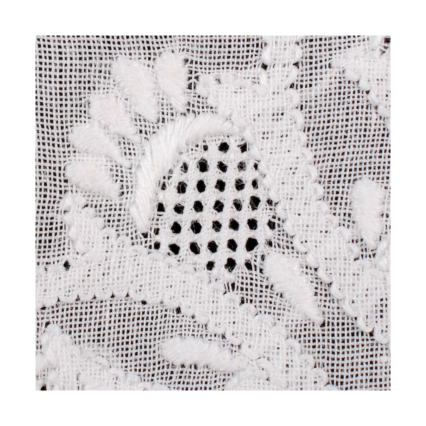Avertissement : ce mouchoir neuf est encore fortement empesé, raidissement nécessaire au travail de la brodeuse. Il faudra éventuellement plusieurs lavages doux à l'eau tiède et à la main pour en retirer l'apprêt et assouplir ses fibres de lin.