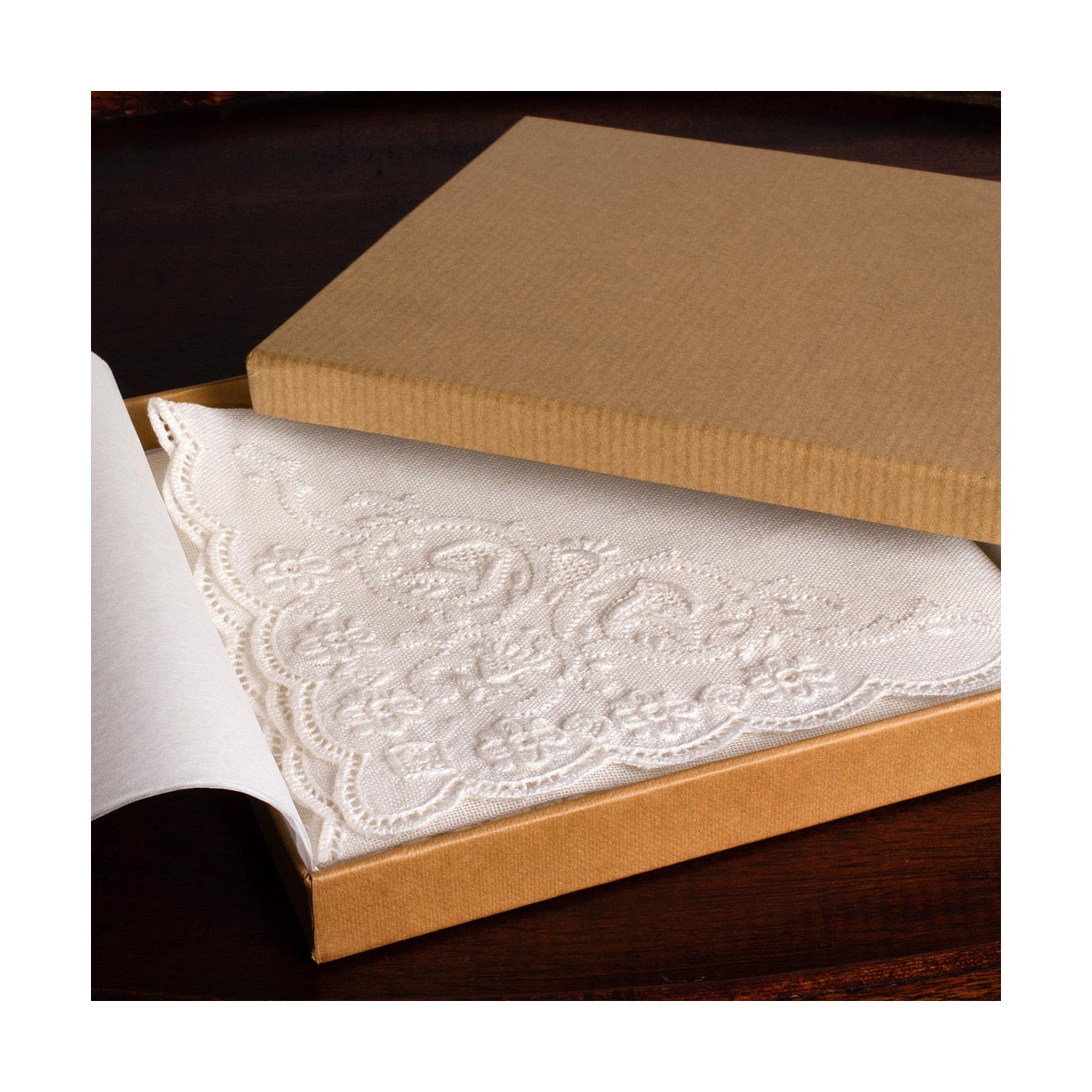 Mouchoir neuf de 30cm x 30cm, vendu à l'unité, enveloppé d'un papier de soie et présenté dans une jolie boîte kraft.
