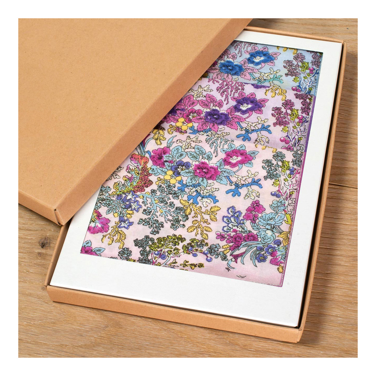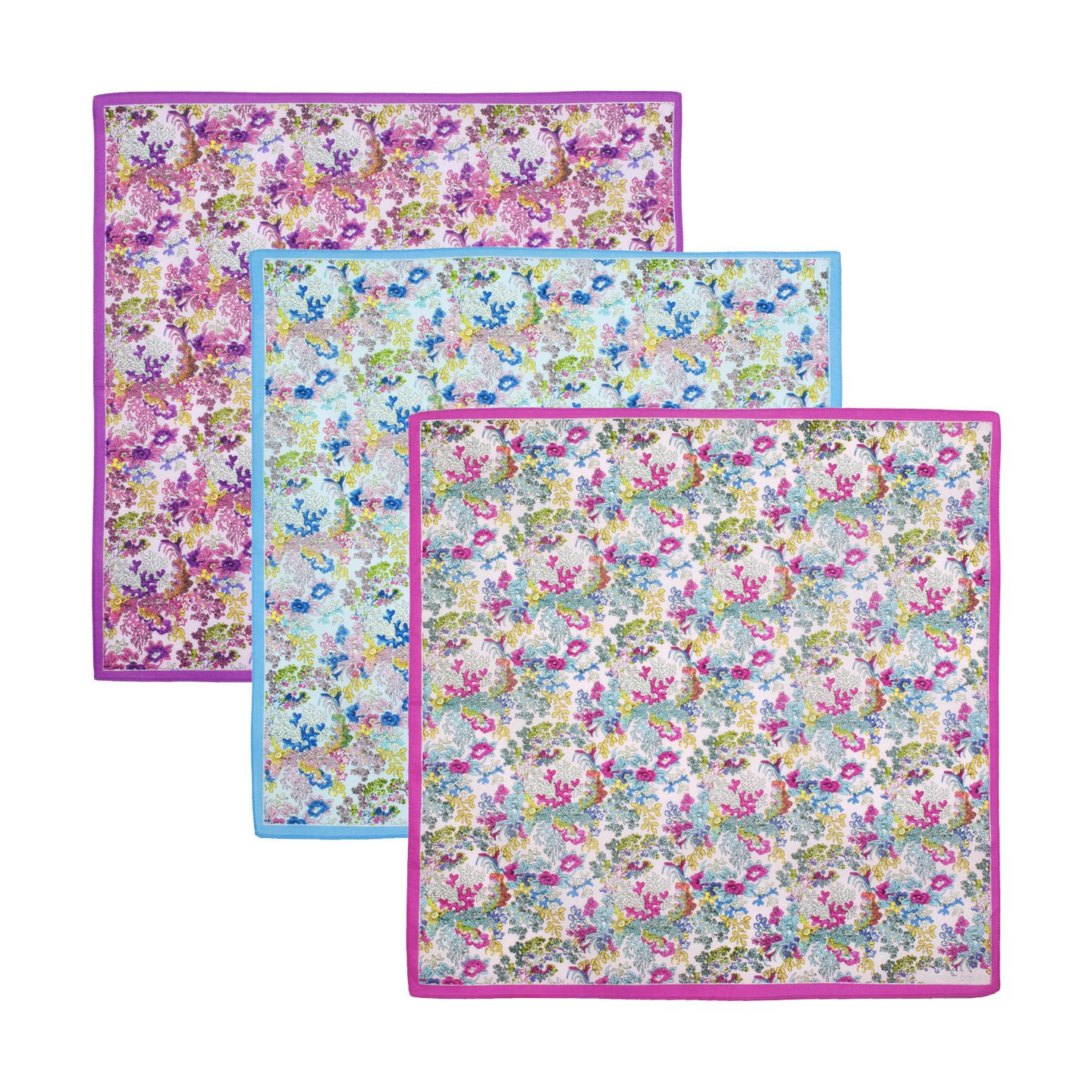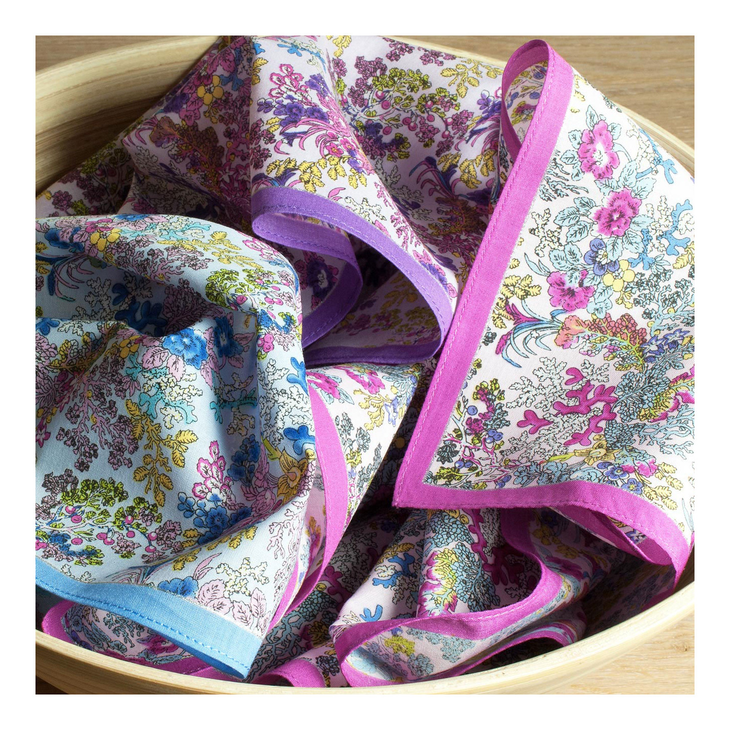 DISCRÈTE LUXURIANCE ♦ Un motif de style Liberty inspiré des sous-bois tropicaux : un bleu d’inspiration Della Robbia, un rose phlox et un mauve prairie. Abondance et exubérance d’une végétation fleurie dont le foisonnement illuminera vos tiroirs et vos sacs à main. Des mouchoirs qui se porteront également comme gavroche ou foulard de cou. A utiliser sans modération.