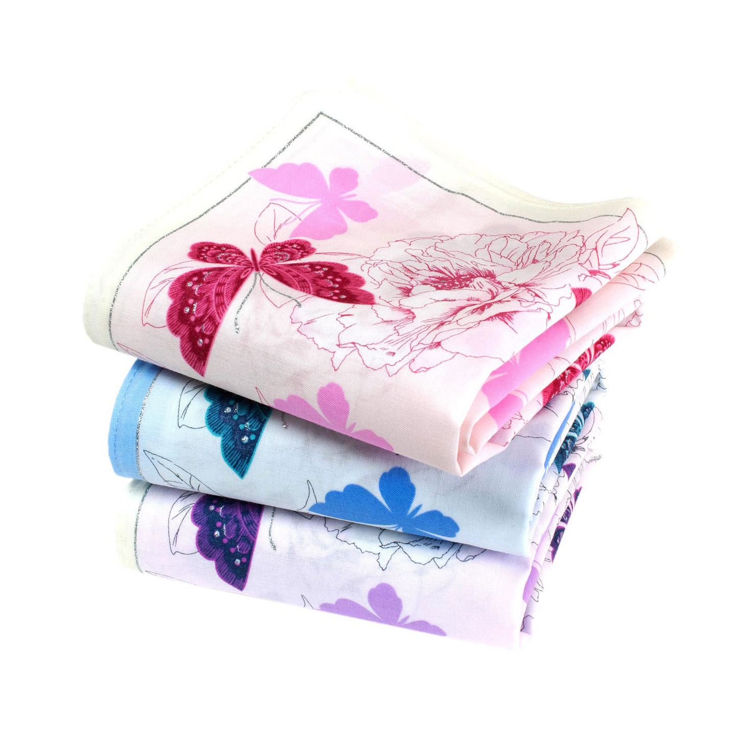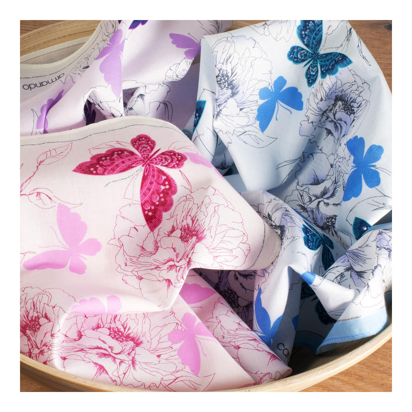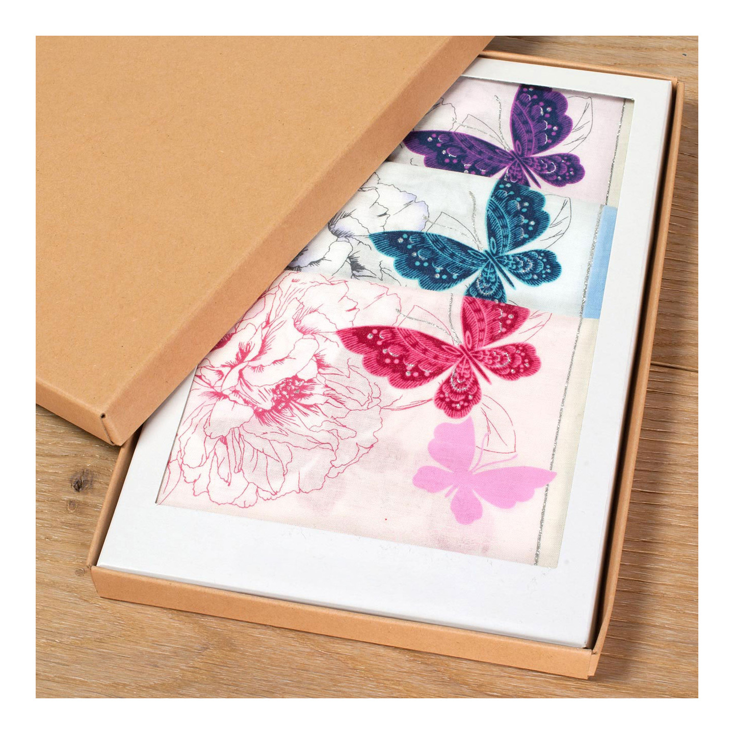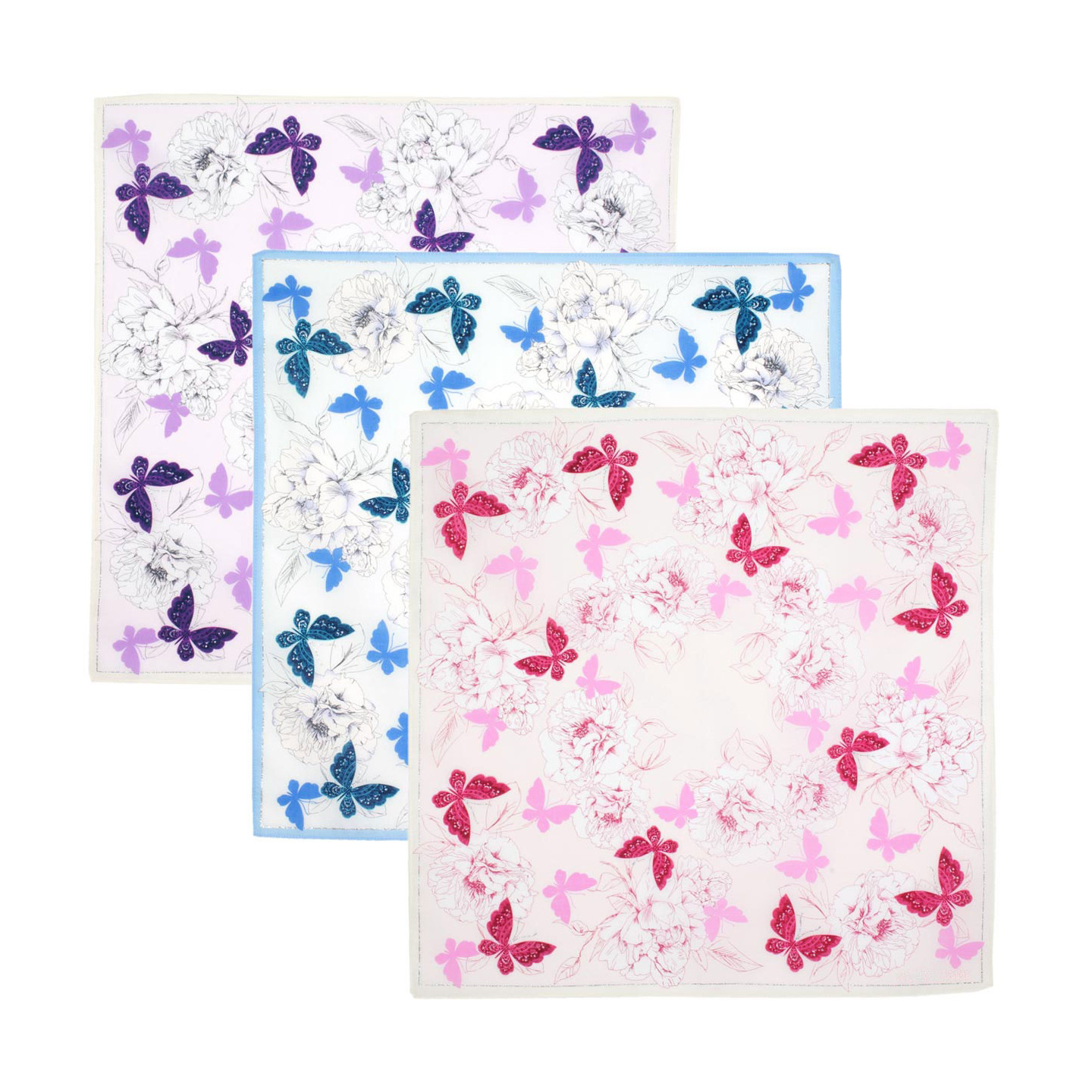 Fins mouchoirs imprimés pivoines et papillons.