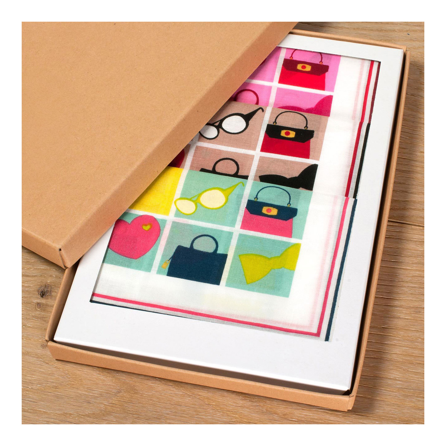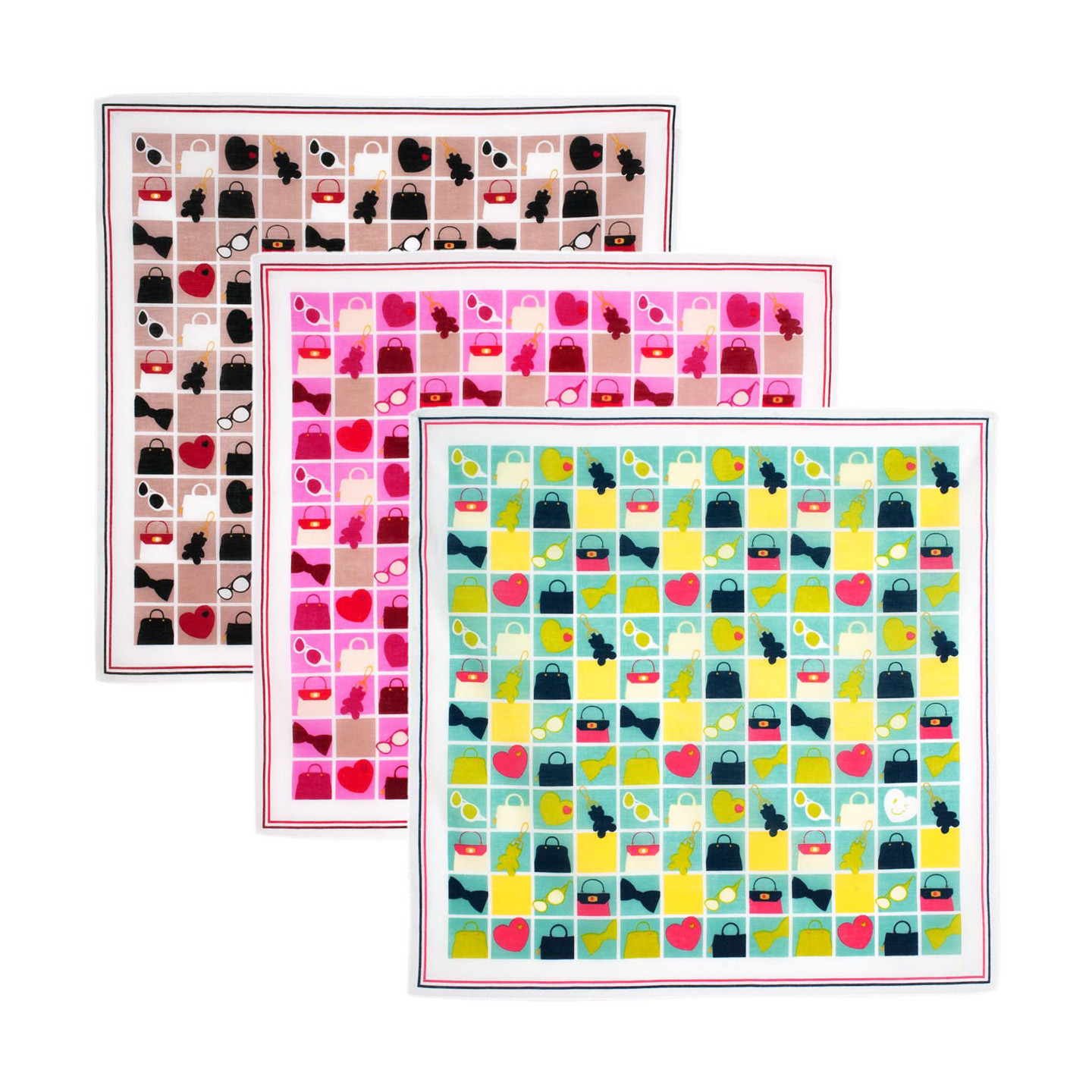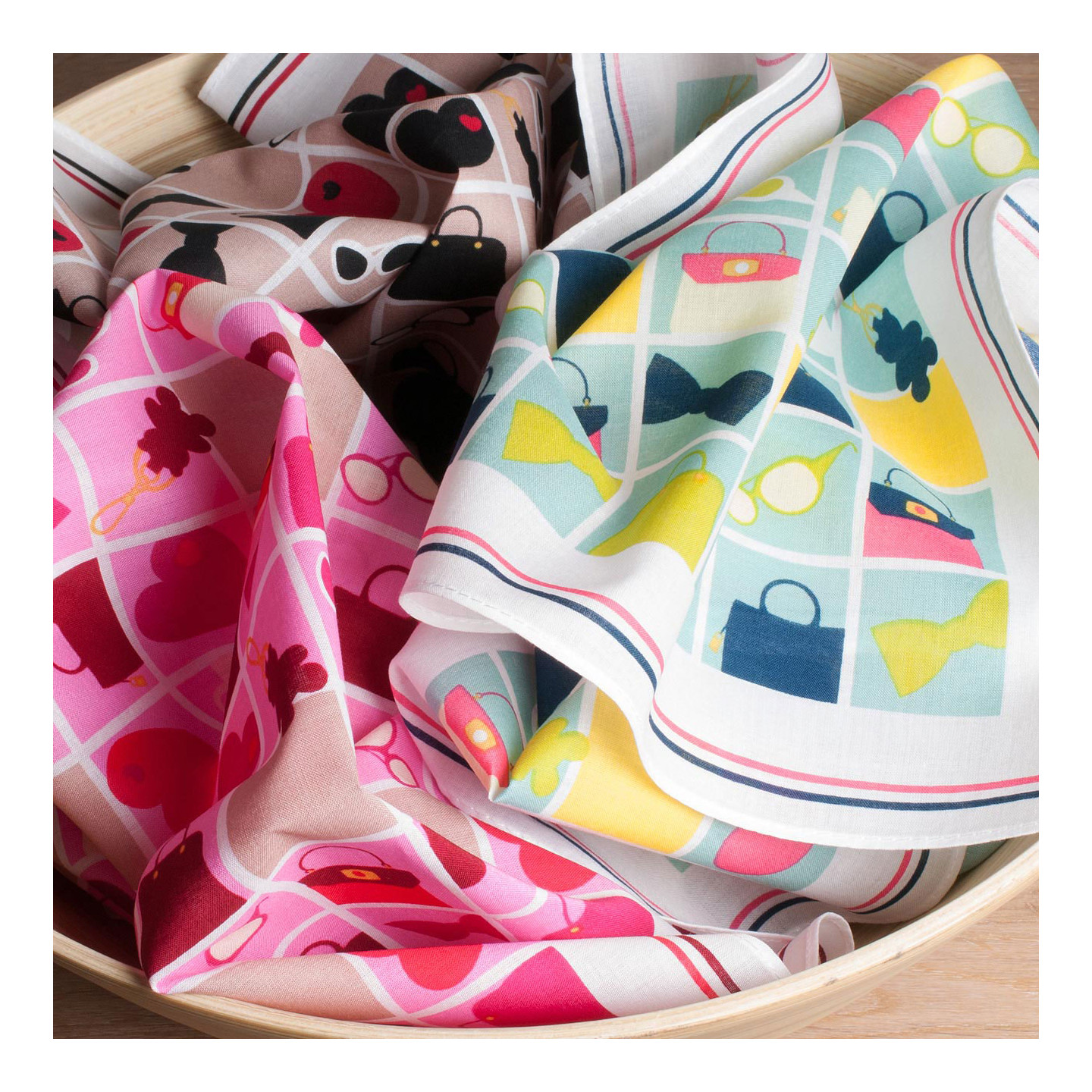 POUR LES FASHIONISTAS ♦ Une mosaïque de sacs à main, lunettes et porte-clés dans une triple variation : rouge et noir, rose et rouge, bleu porcelaine et bleu légion. Des mouchoirs qui se porteront également comme gavroche ou foulard de cou ainsi que noué autour du sac à main. Gai et souriant.