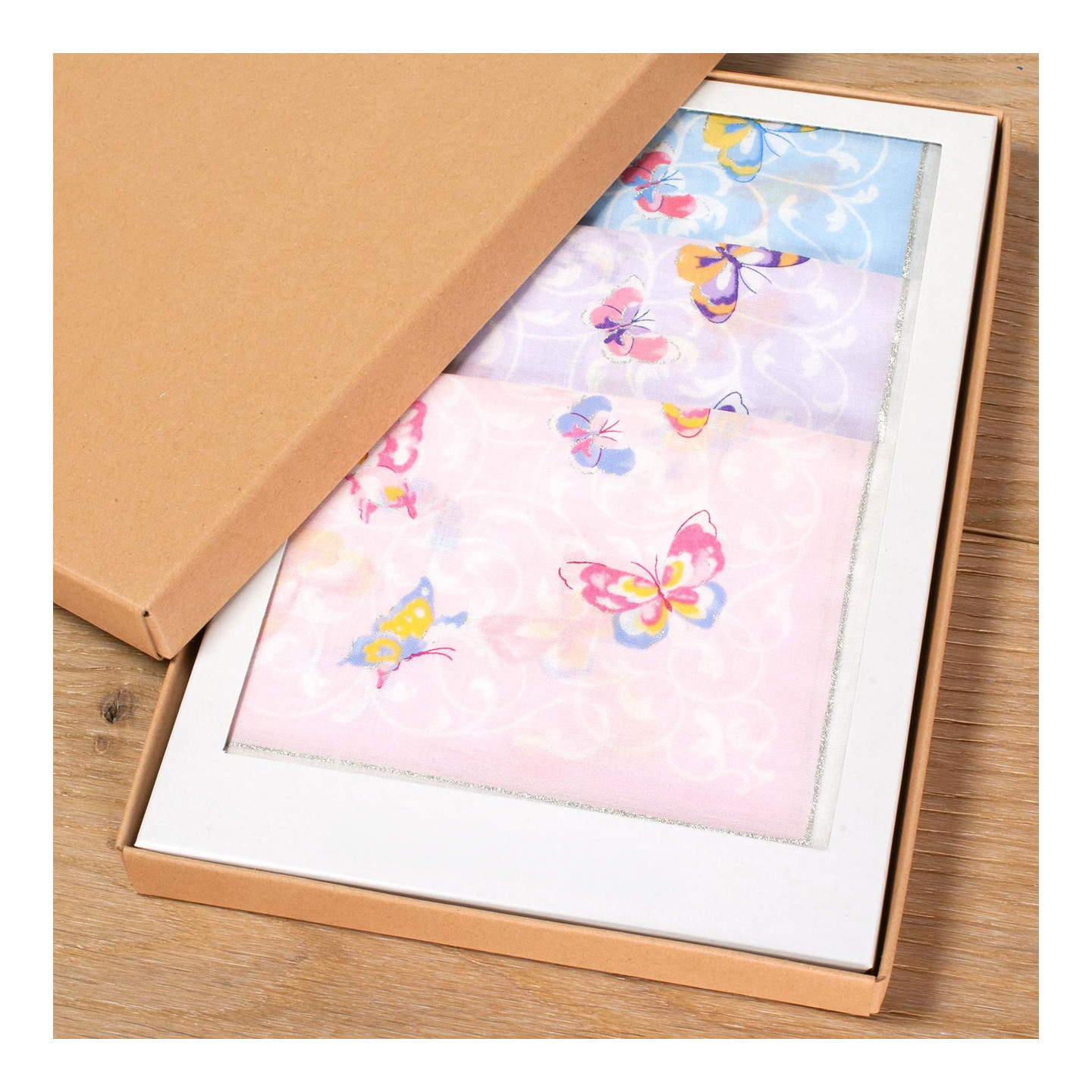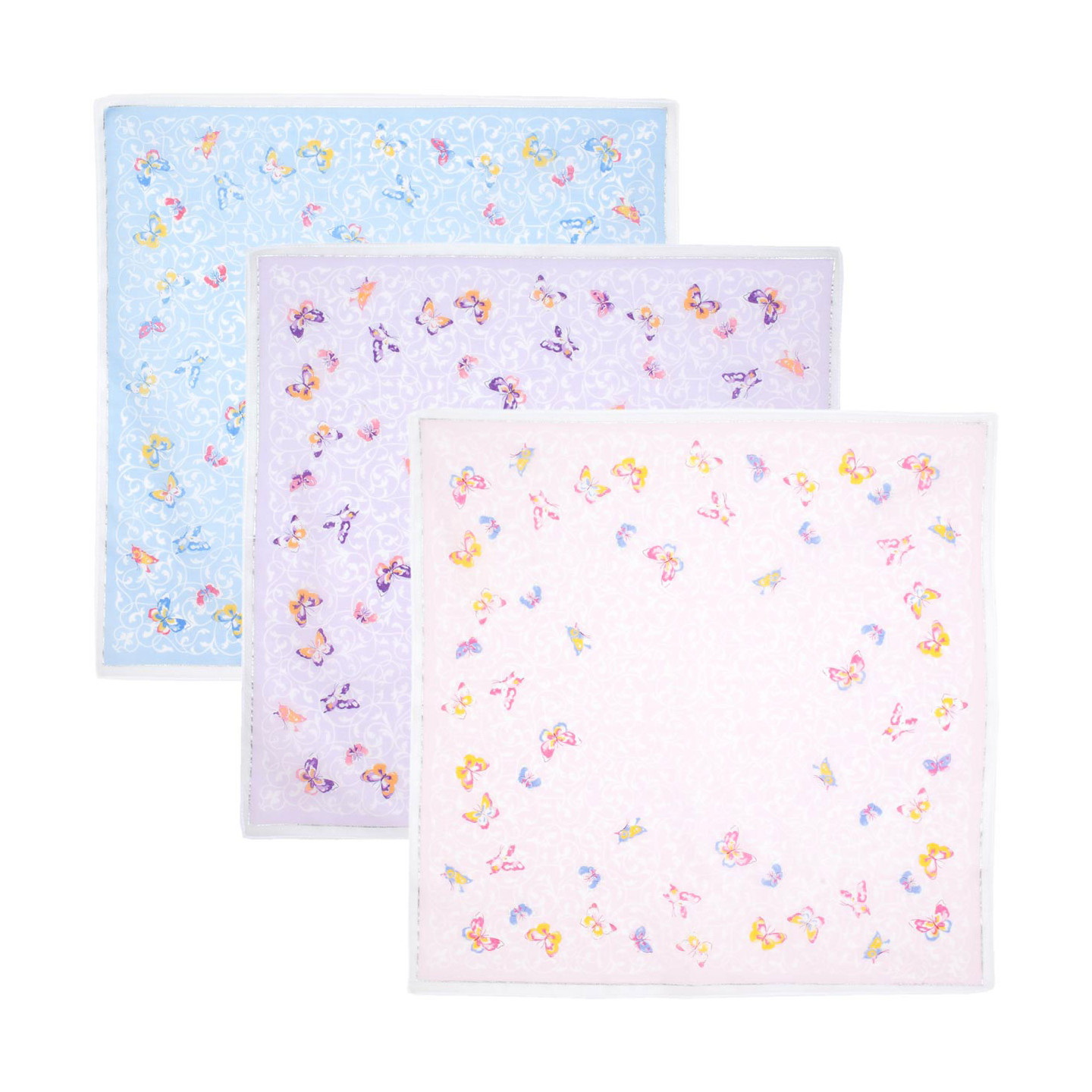 DOLCE VITA. 3 mouchoirs d’une ineffable douceur : une envolée de papillons sur fond pastel rose, bleu et mauve dans un lacis de feuillages et de rinceaux. De très subtiles incrustations de couleur argent. Charme et légèreté, féminité et délicatesse !