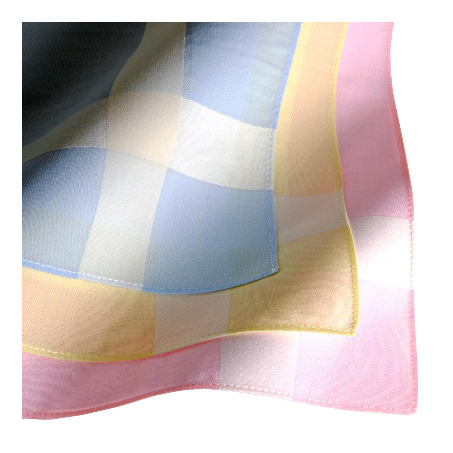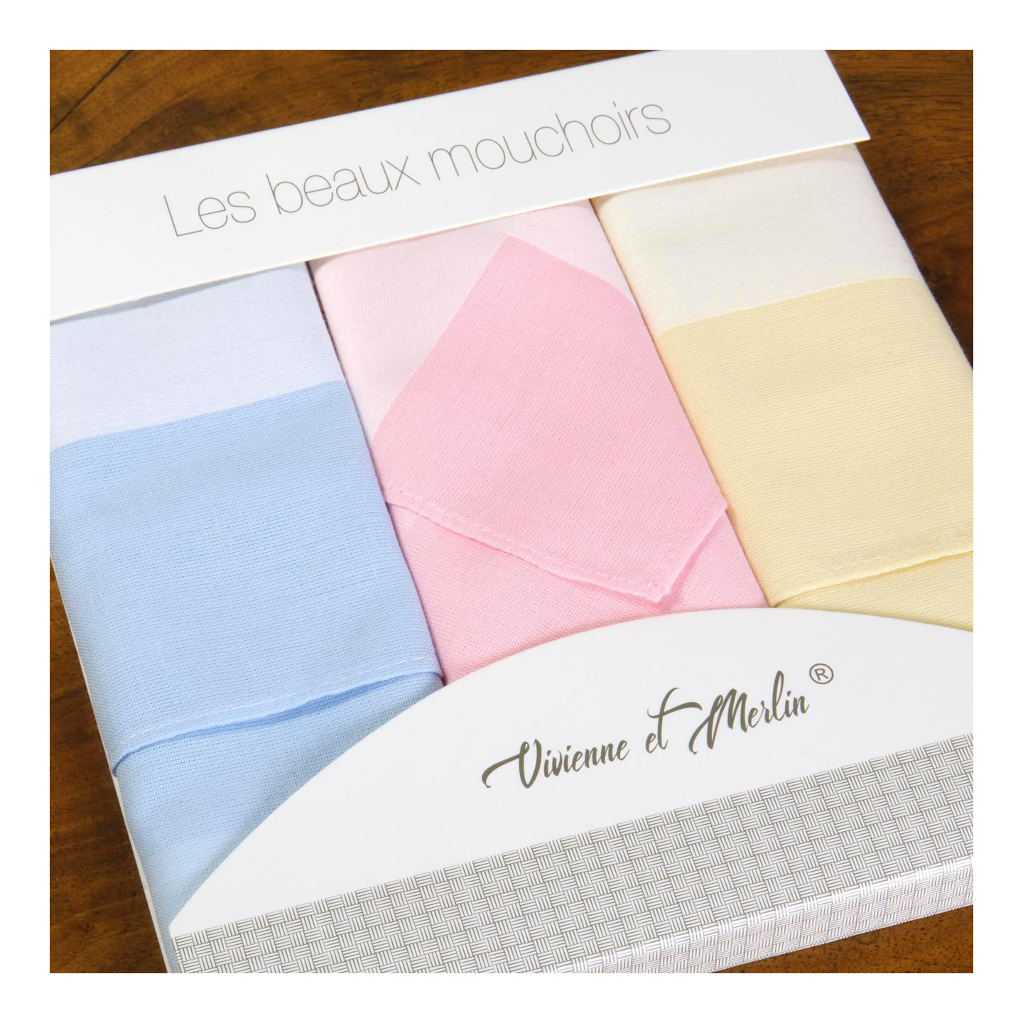 - Assortiment de 3 mouchoirs aux couleurs assorties, conditionnés dans un blister cartonné.