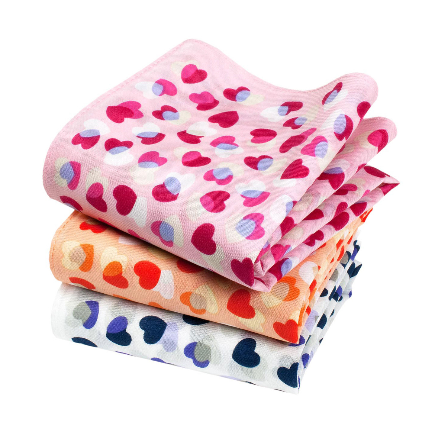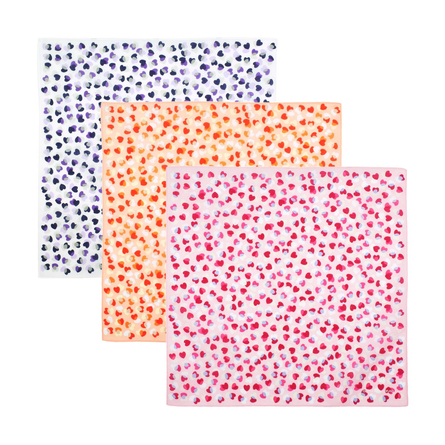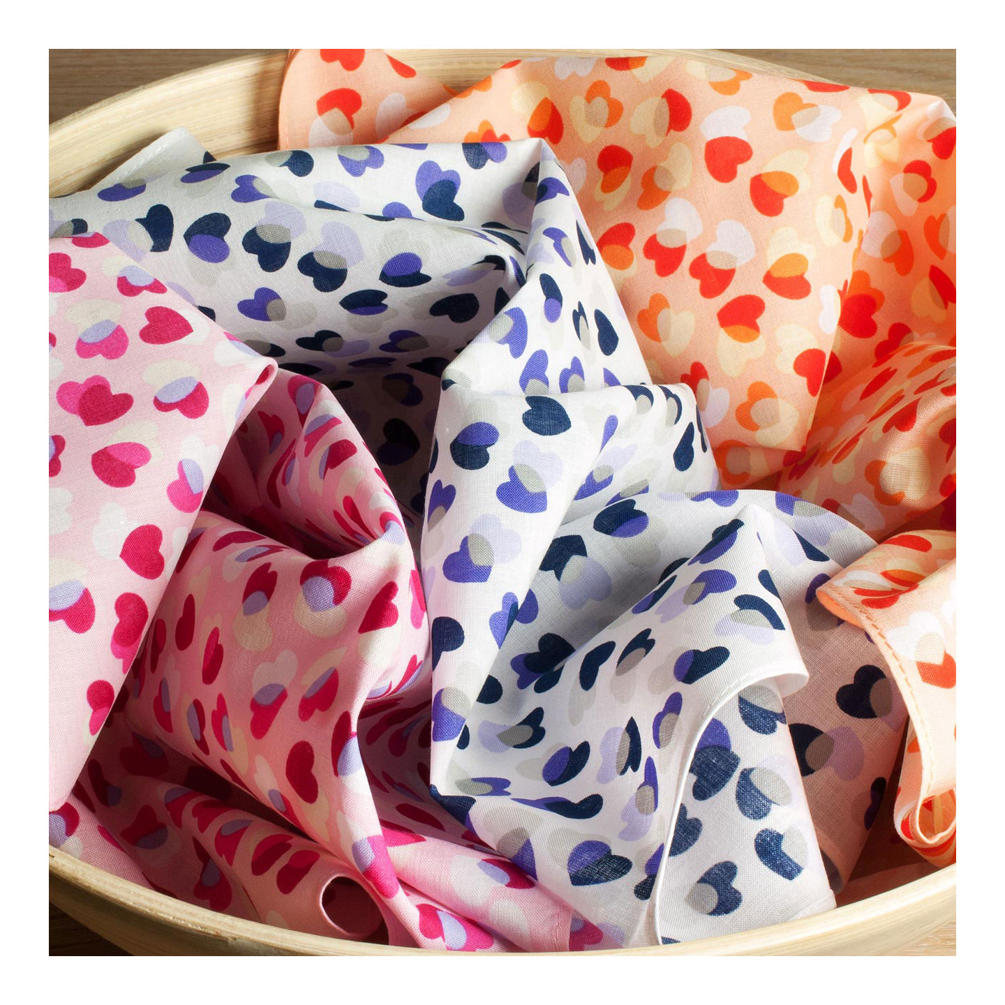 Trois mouchoirs tendres et généreux qui mettent le cœur en joie. Des tonalités contrastées, gaies et pimpantes sur une base de bleu marine, d’orangé et de rouge framboise. De quoi voir la vie en rose… tous les jours !