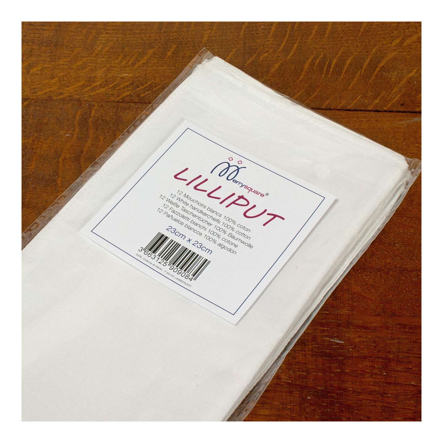 Taille environ 23cm x 23cm, 100% coton, en sachet cristal de 12 unités.