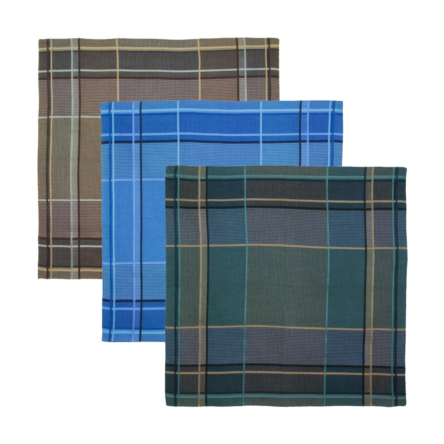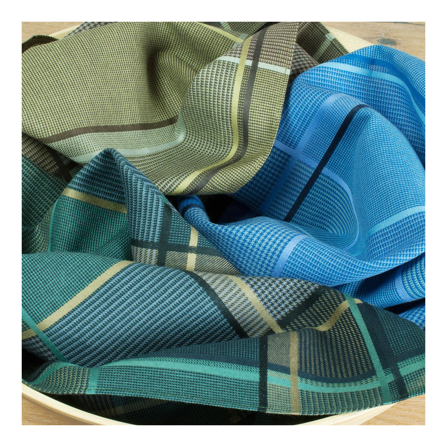 Ces mouchoirs de style tweed à l’armure sergé s’inviteront au quotidien : un bleu lumineux, un bleu-vert et un beige mordorés. Ces teintes s’accorderont avec nombre de vêtements. En accompagnement de tenues classe et sport. Des mouchoirs d’une belle qualité.