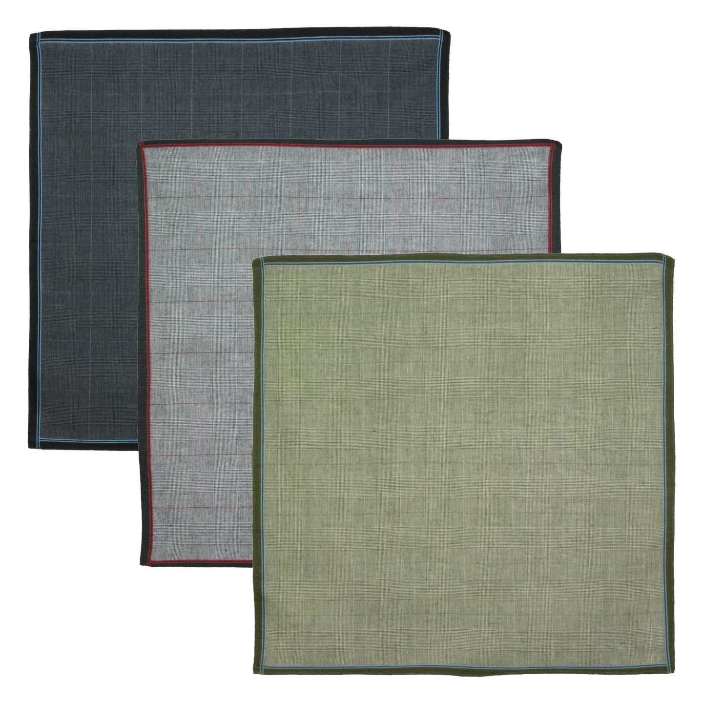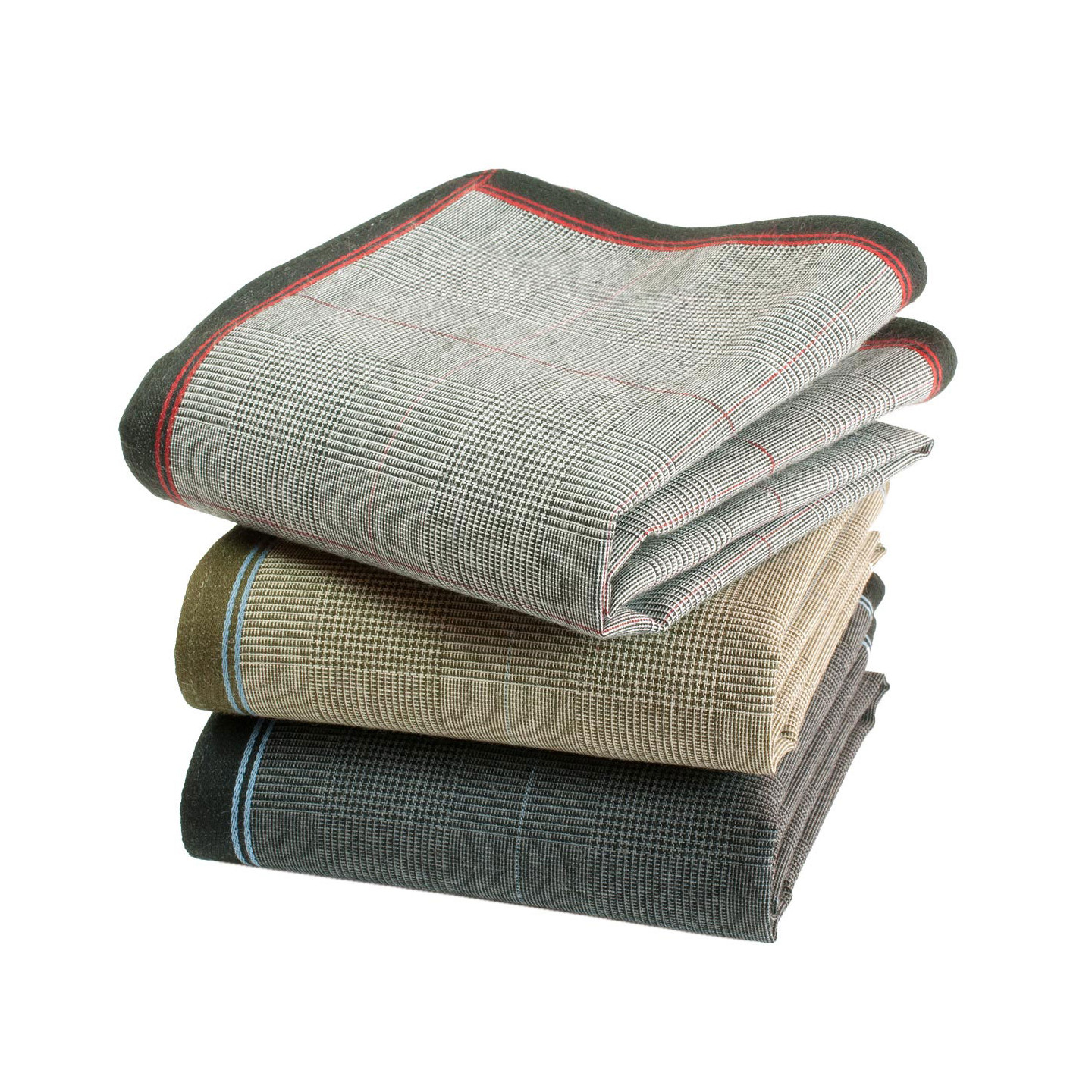 Trois mouchoirs en tissu Prince de Galles qui raviront les amateurs d’élégance et de style. Un gris foncé, un gris moyen et un vert kaki du plus bel effet avec un liteau rappelant le motif central.