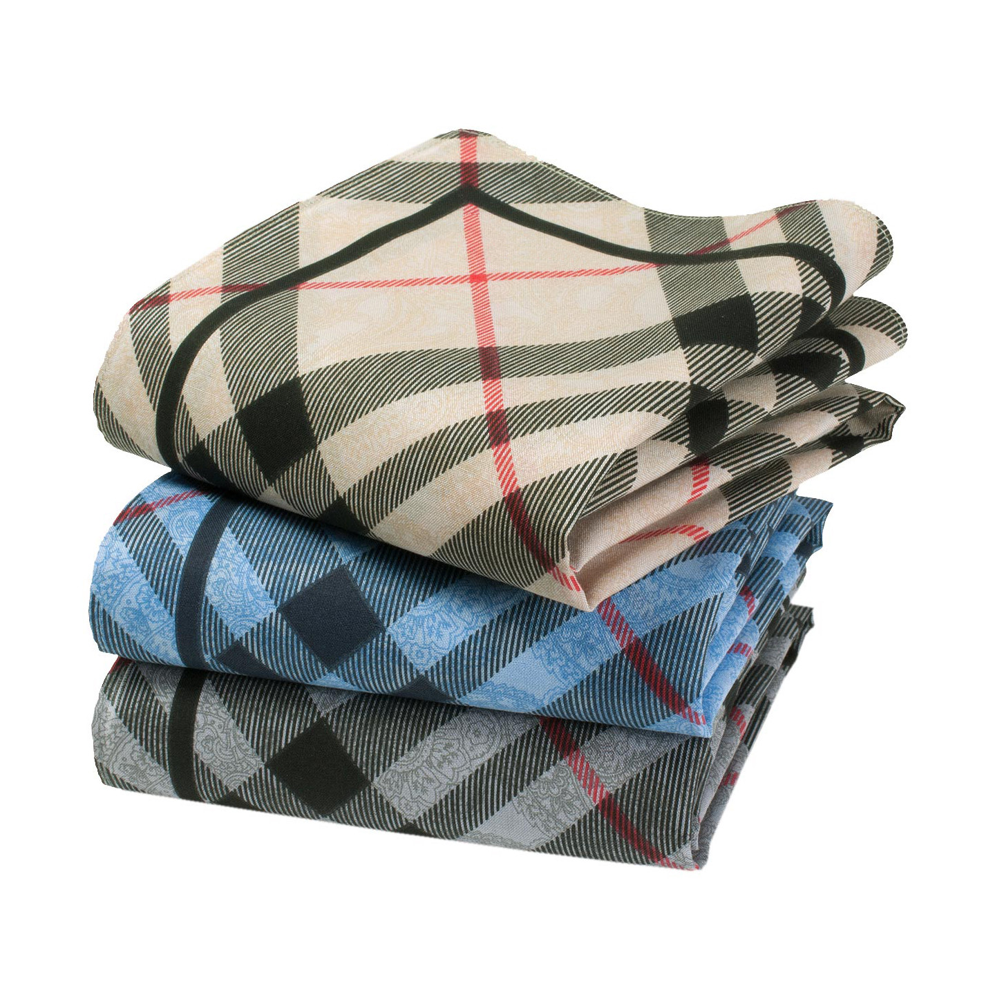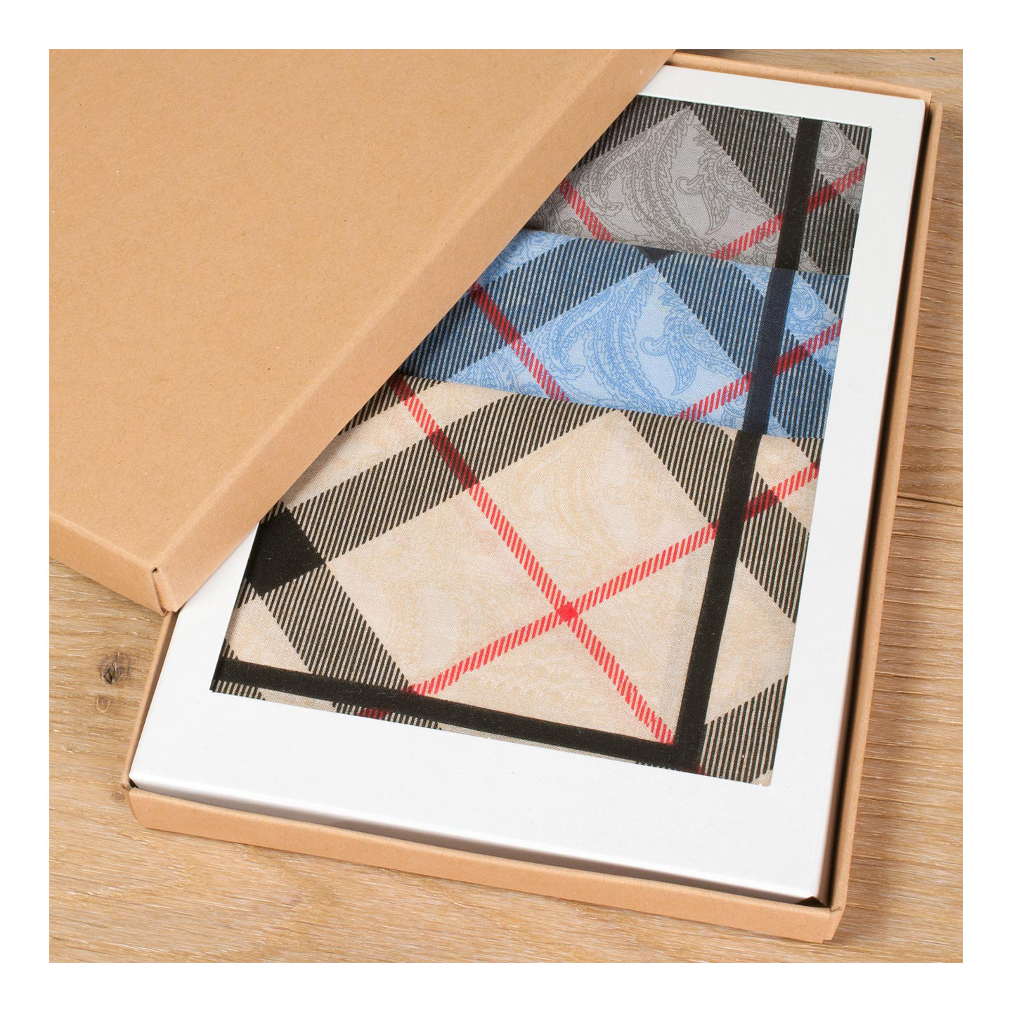 Trois superbes mouchoirs imprimés beige sable, bleu céleste et gris pommelé qui plairont aux inconditionnels d’une célèbre marque anglaise. Un motif tartan noir et rouge en diagonale sur un délicat fond de paisley en quasi-transparence. Un ajout heureux qui rafraîchit et dynamise l’ensemble. Chic et fun.