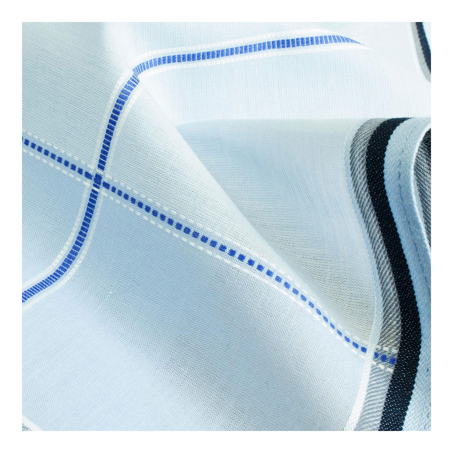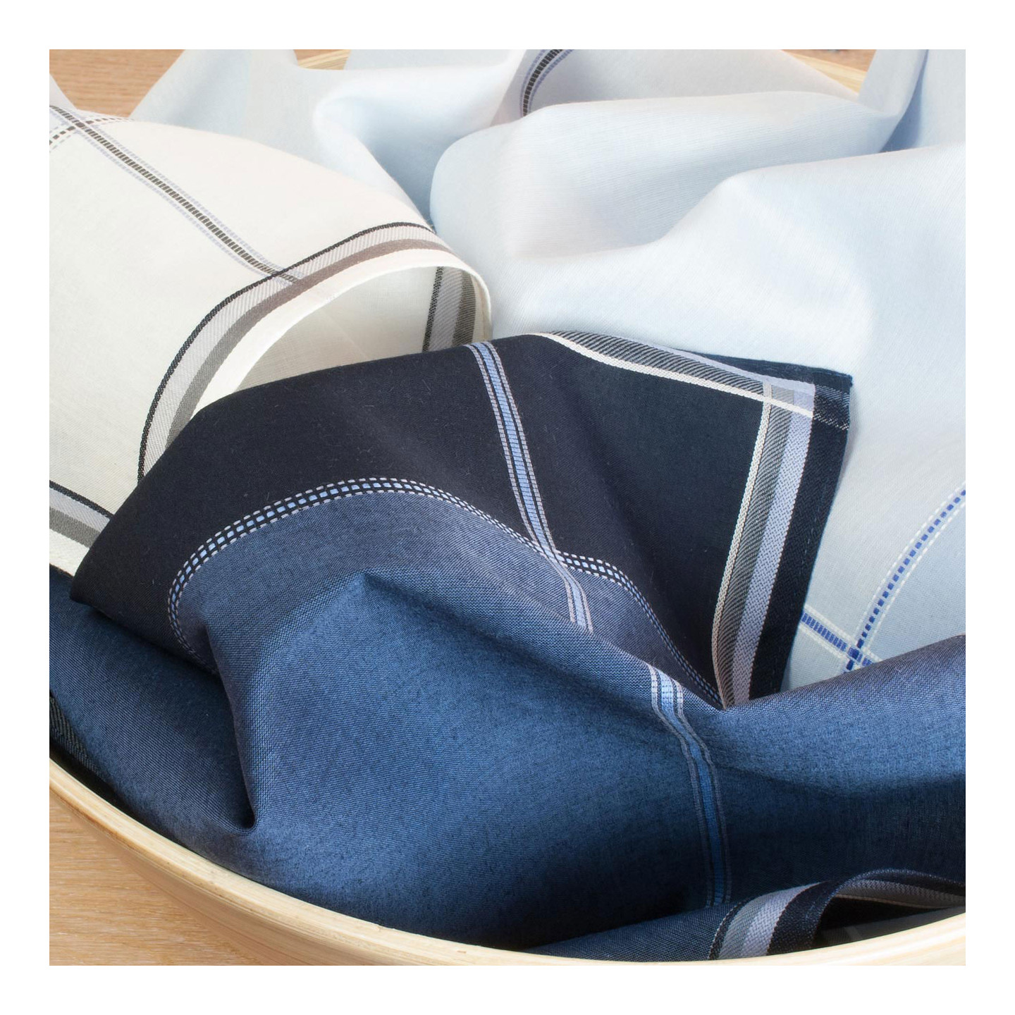 TISSE-TEINT 100% COTON 60S ♦ Pur coton teinté dans la masse avant tissage pour une meilleure tenue des couleurs dans le temps. Une étoffe d’une qualité unique, qui, dans la main, offre souplesse et soyeux. Remarquables finitions consistant en un discret ourlet piqué à plat aux coins parfaitement cousus. Des mouchoirs séduisants.