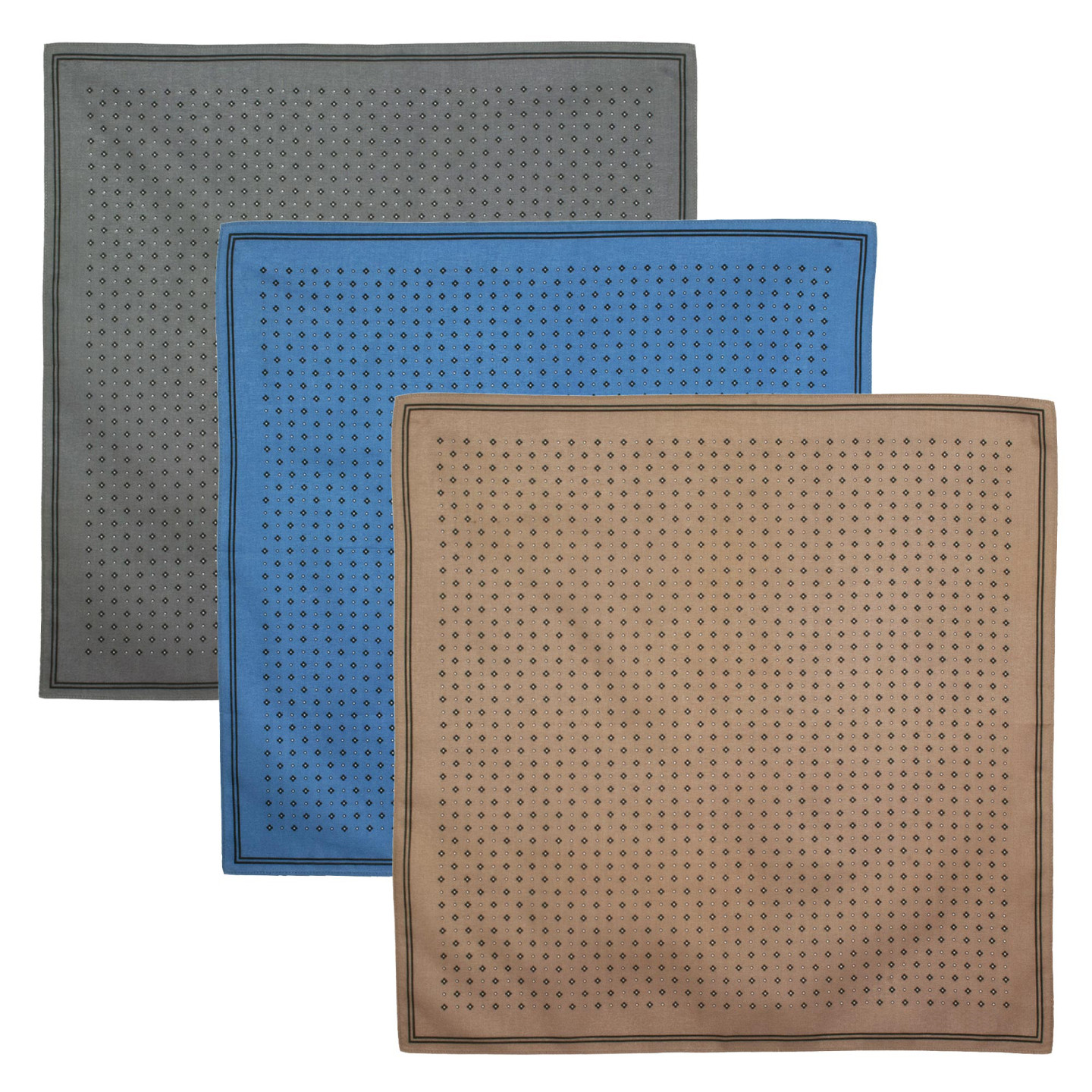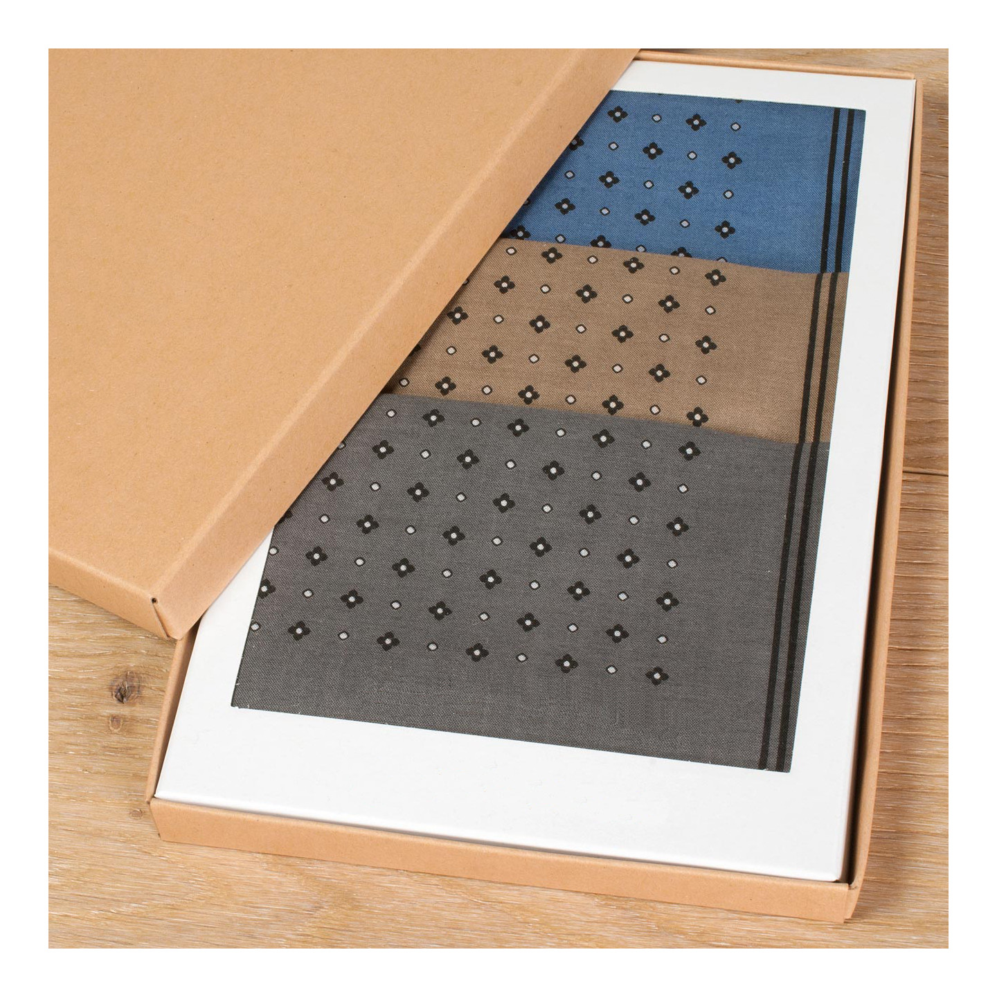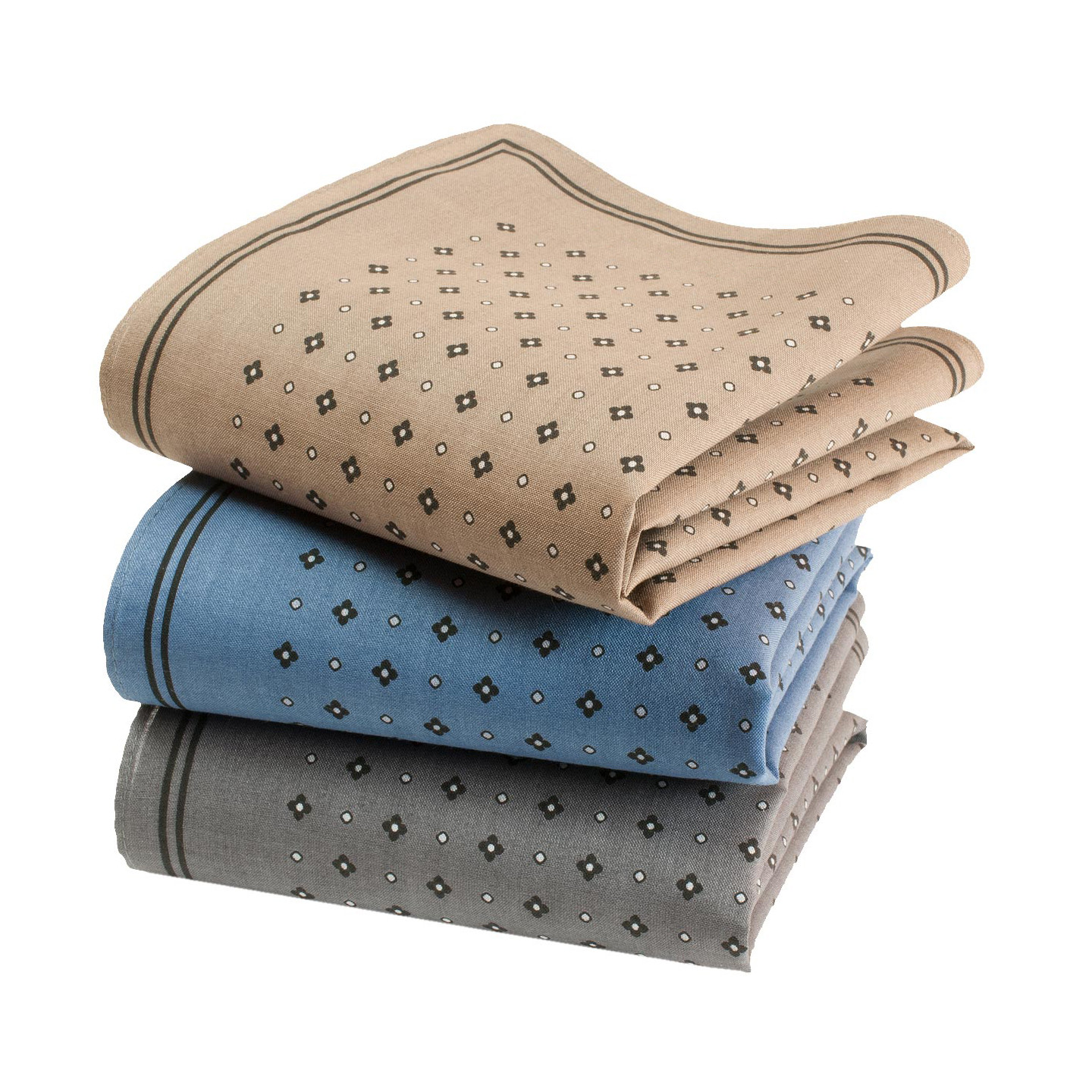 Du beige travertin, du gris bois flotté et un bleu petit matin pour cette déclinaison de mouchoirs à motif mosaïque de petites fleurs stylisées. Punch et sobriété associés pour accompagner tous les coloris préférés des messieurs, du bleu jeans à la veste camel et au sobre costume, fidèle associé de toutes les cérémonies. Un sans-faute équilibré. Utilisable en élégante pochette de costume.