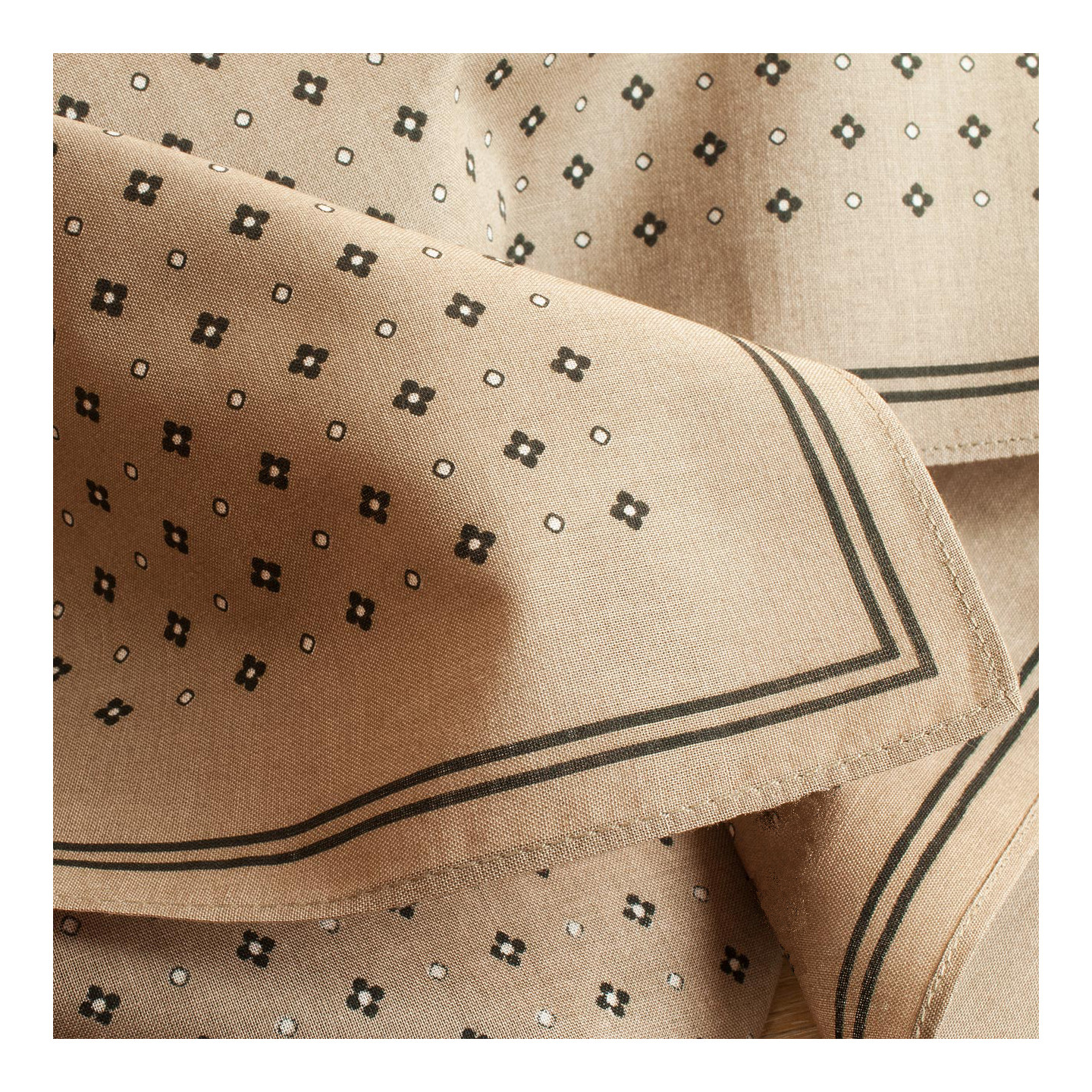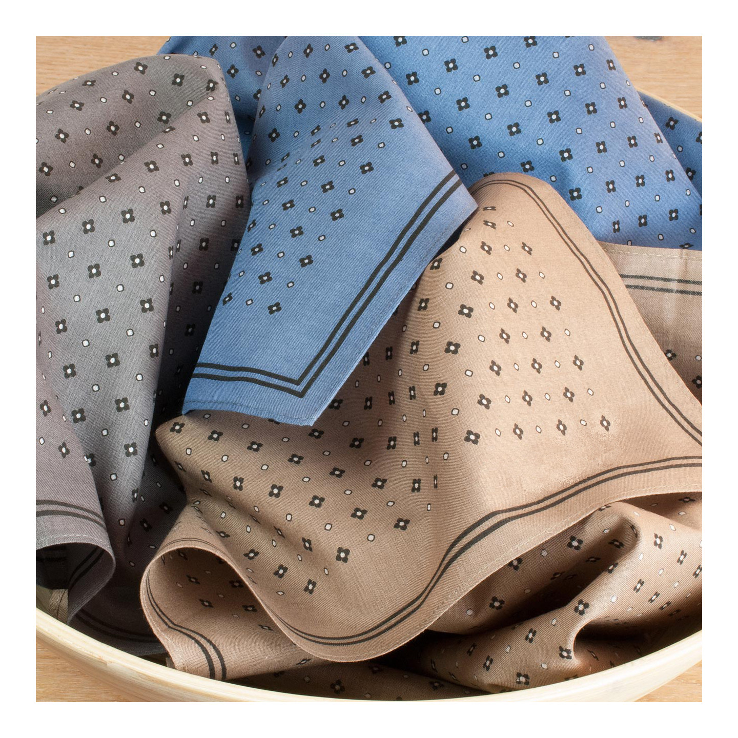 IMPRIME 100% COTON 60S ♦ Un motif réalisable par la seule technique de l’impression avec donc un envers de tissu moins colorisé. Une étoffe d’une qualité unique qui, dans la main, offre souplesse et légèreté. Remarquables finitions consistant en un discret ourlet piqué à plat aux coins parfaitement cousus. Des mouchoirs mais aussi des accessoires de mode.