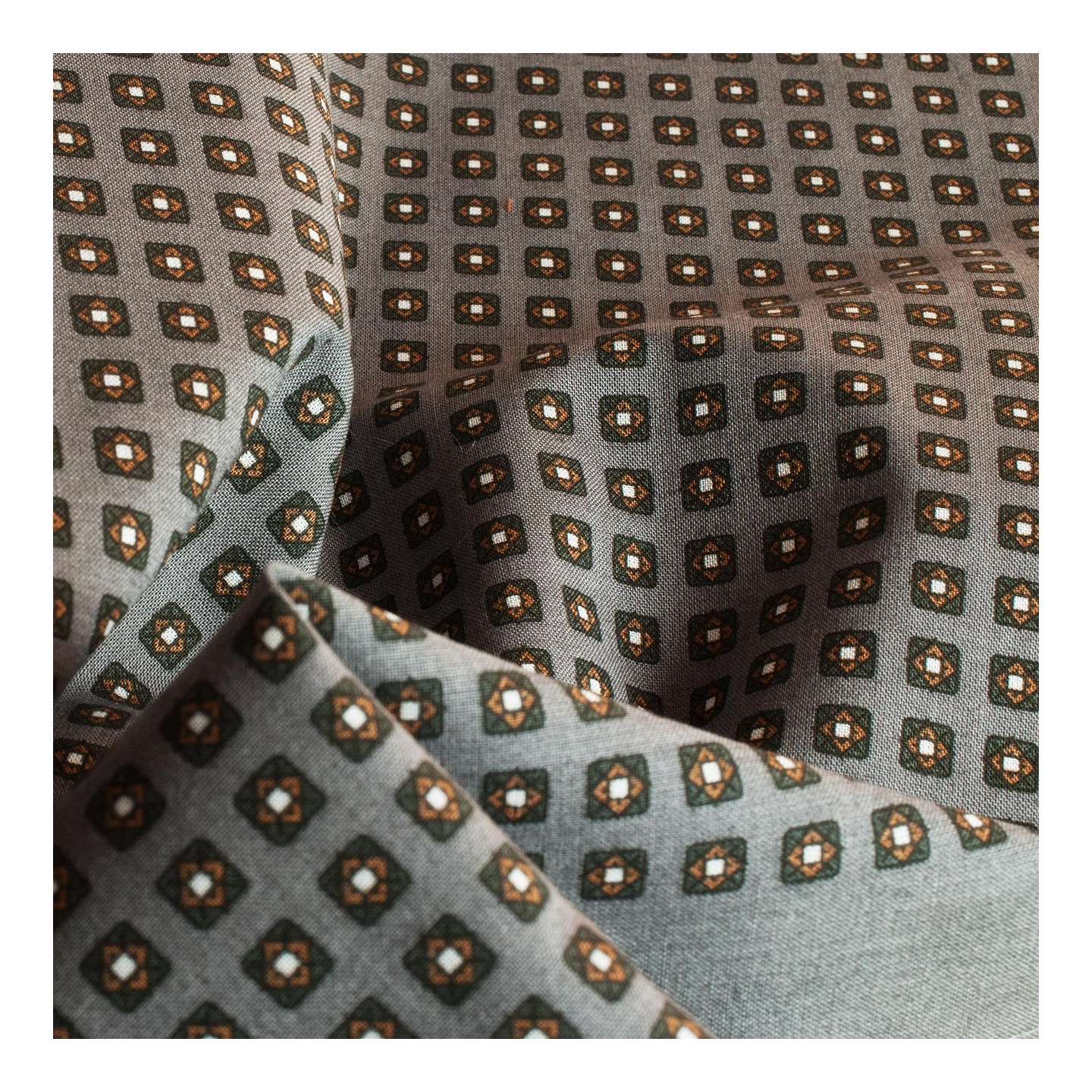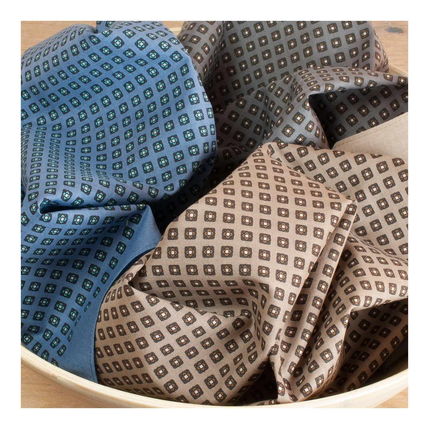 IMPRIMÉ 100% COTON 60S ♦ Un motif réalisable par la seule technique de l’impression avec donc un envers de tissu moins colorisé. Une étoffe d’une qualité unique qui, dans la main, offre souplesse et légèreté. Remarquables finitions consistant en un discret ourlet piqué à plat aux coins parfaitement cousus. Des mouchoirs mais aussi des accessoires de mode.