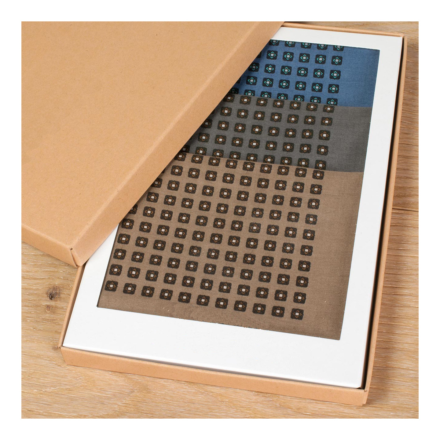 COFFRET KRAFT ♦ Présentés dans une séduisante boîte cloche en matériau recyclé, signée de la marque. D’origine, le couvercle est emboîté par-dessous et le tout protégé sous un film cristal pour une visualisation optimale des motifs. Un beau cadeau pour homme moderne et exigeant.