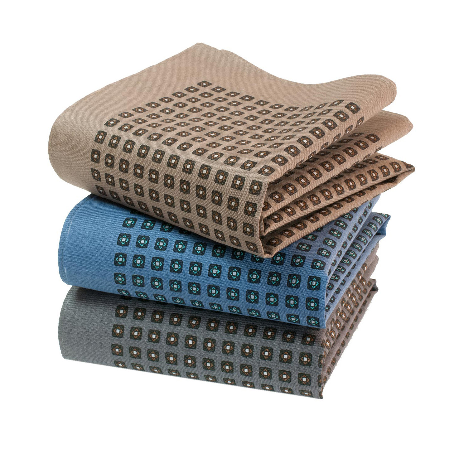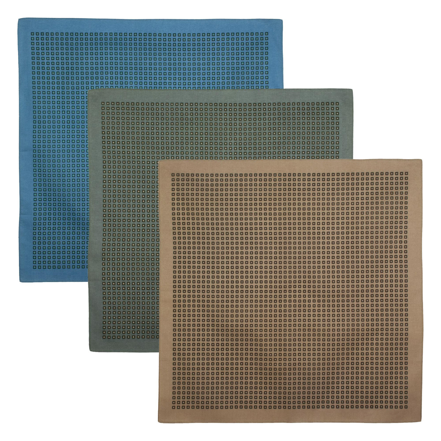 Trois mouchoirs imprimés aux teintes de mi-saison (gris peau d’éléphant, bleu des colonies et beige nomade). Un motif médaillon de cabochons très masculins qui se feront remarquer pour leur style. Parfait pour égayer vestes et pantalons qui s’apprêtent à prendre du bon temps au soleil d’un été proche. Sagesse, sobriété et punch tout à la fois. Utilisable en élégante pochette de costume.