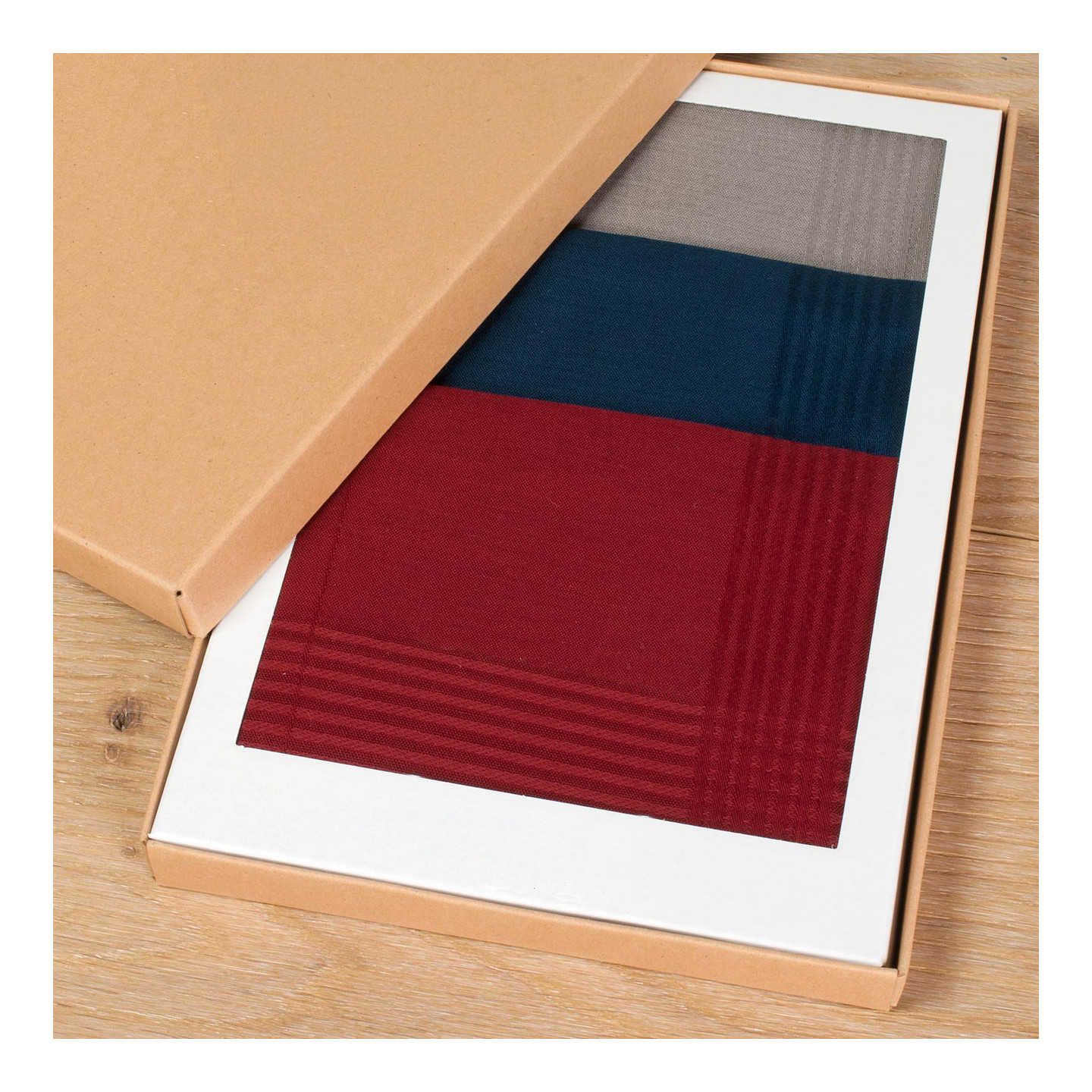 Bleu, bordeaux, beige, voilà de quoi faire face à toutes les situations sans ostentation. Ces mouchoirs unis au gracieux et discret quadrillage central et à la bordure agrémentée de liteaux ton sur ton seront de fidèles et appréciés compagnons de toutes les belles journées.